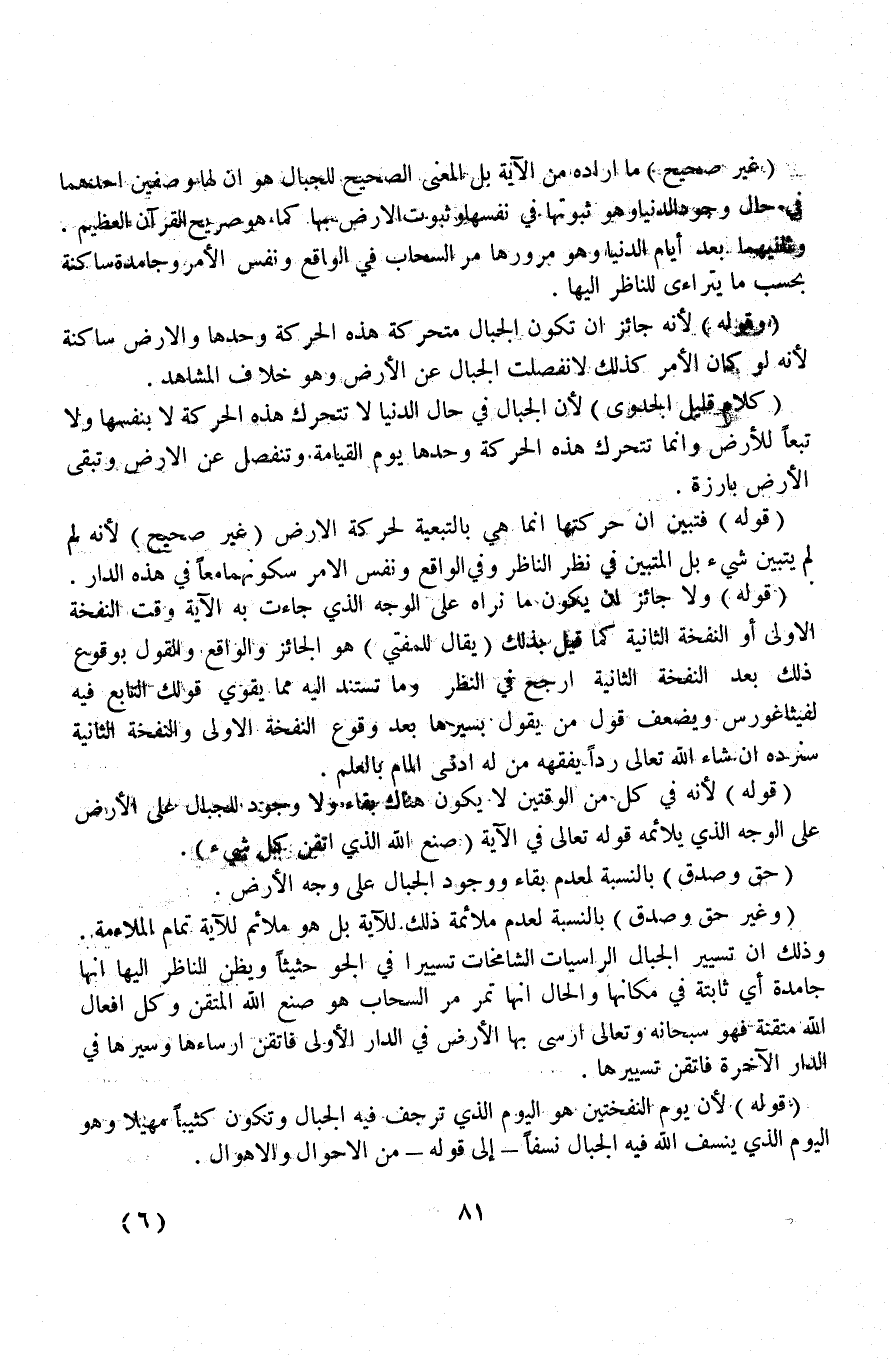 (قوله) ولا جائز أن يكون ما نراه على الوجه الذي جاءت به الآية وقت النفخة الأولى أو النفخة الثانية كما قيل بذلك (يقال للمفتي) هو الجائز والواقع والقول بوقوع ذلك بعد النفخة الثانية أرجح في النظر وما تستند إليه مما يقوي قولك التابع فيه لفيثاغورس ويضعف قول من يقول بسيرها بعد وقوع النفخة الأولى أو النفخة الثانية سنرده إن شاء الله تعالى رداً يفقهه من له أدنى إلمام بالعلم.