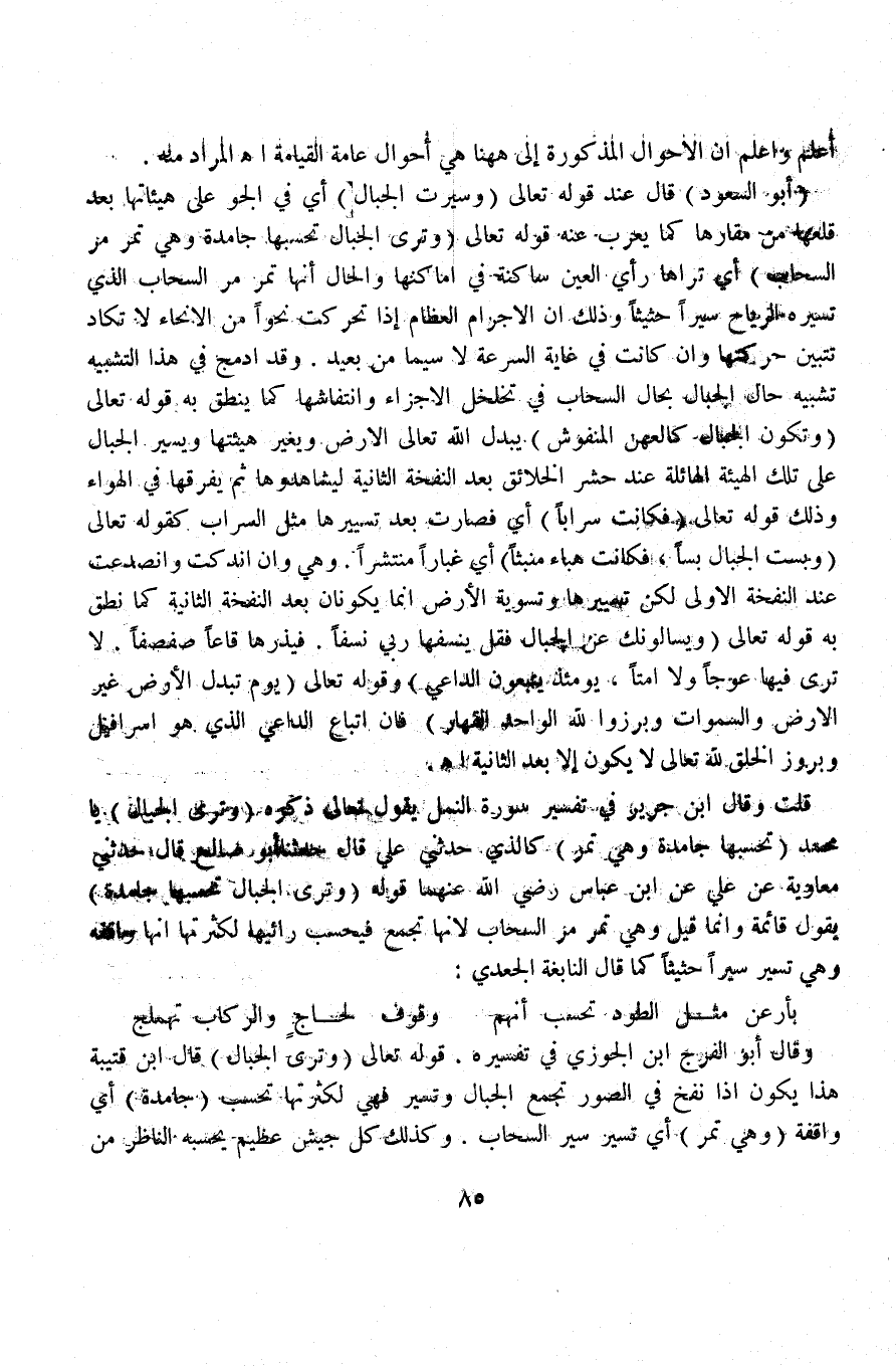 وقال أبو الفرج ابن الجوزي في تفسيره. قوله تعالى (وترى الجبال) قال ابن قتيبة هذا يكون إذا نفخ في الصور تجمع الجبال وتسير فهي لكثرتها تحسب (جامدة) أي واقفة (وهي تمر) أي تسير سير السحاب. وكذلك كل جيش عظيم يحسبه الناظر من