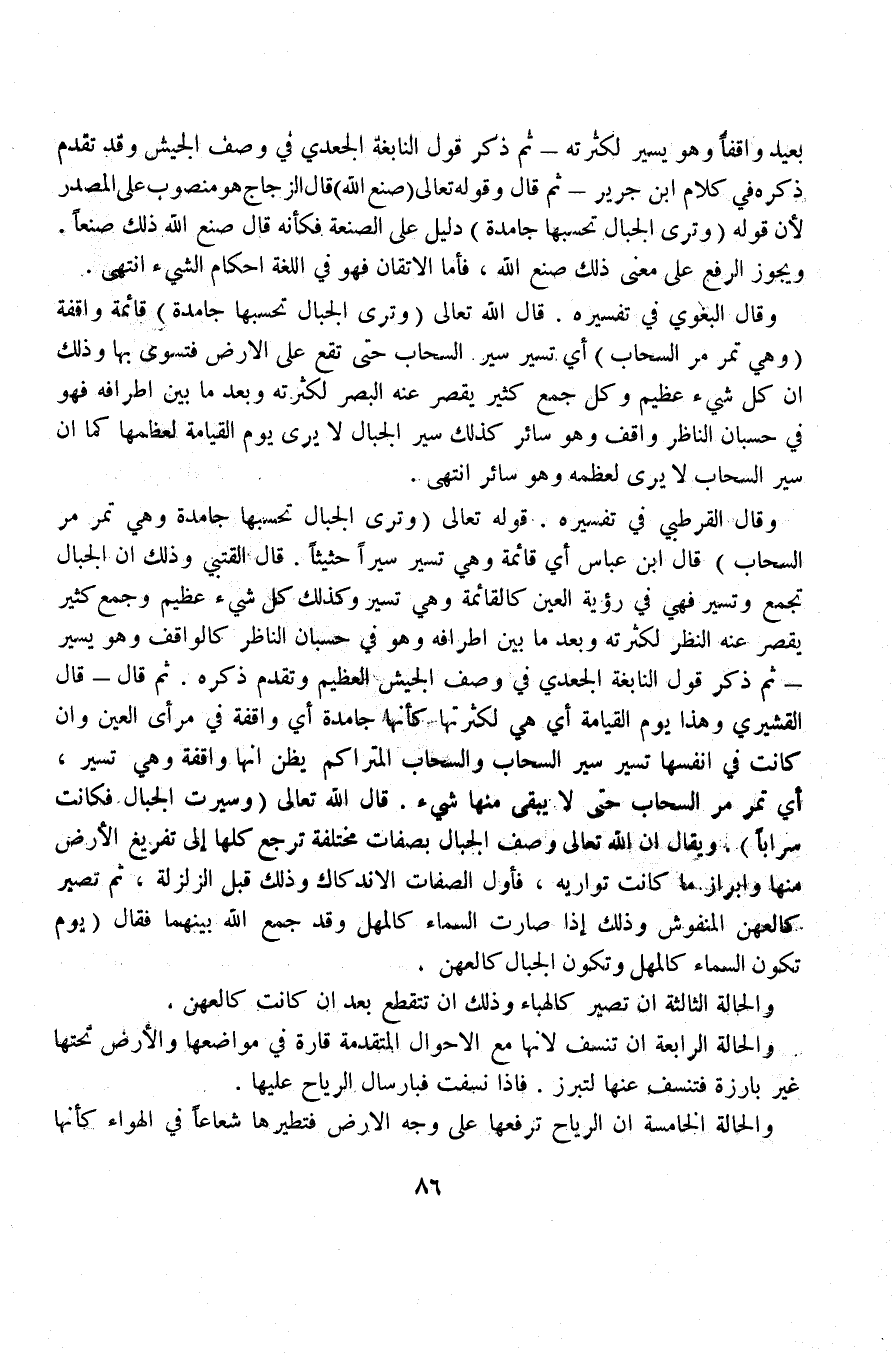 وقال القرطبي في تفسيره. قوله تعالى (وترى الجبال تحسبها جامدة وهي تمر مر السحاب) قال ابن عباس أي قائمة وهي تسير سيراً حثيثاً. قال القتبي وذلك أن الجبال تجمع وتسير فهي في رؤية العين كالقائمة وهي تسير وكذلك كل شيء عظيم وجمع كثير يقصر عنه النظر لكثرته وبعد ما بين أطرافه وهو في حسبان الناظر كالواقف وهو يسير - ثم ذكر قول النابغة الجعدي في وصف الجيش العظيم وتقدم ذكره. ثم قال - قال القشيري وهذا يوم القيامة أي هي لكثرتها كأنها جامدة أي واقفة في مرأى العين وإن كانت في أنفسها تسير سير السحاب والسحاب المتراكم يظن أنها واقفة وهي تسير, أي تمر مر السحاب حتى لا يبقى منها شيء. قال الله تعالى (وسيرت الجبال فكانت سراباً). ويقال إن الله تعالى وصف الجبال بصفات مختلفة ترجع كلها إلى تفريغ الأرض منها وإبراز ما كانت تواريه. فأول الصفات الاندكاك وذلك قبل الزلزلة, ثم تصير كالعهن المنفوش وذلك إذا صارت السماء كالمهل وقد جمع الله بينهما فقال (يوم تكون السماء كالمهل وتكون الجبال كالعهن).