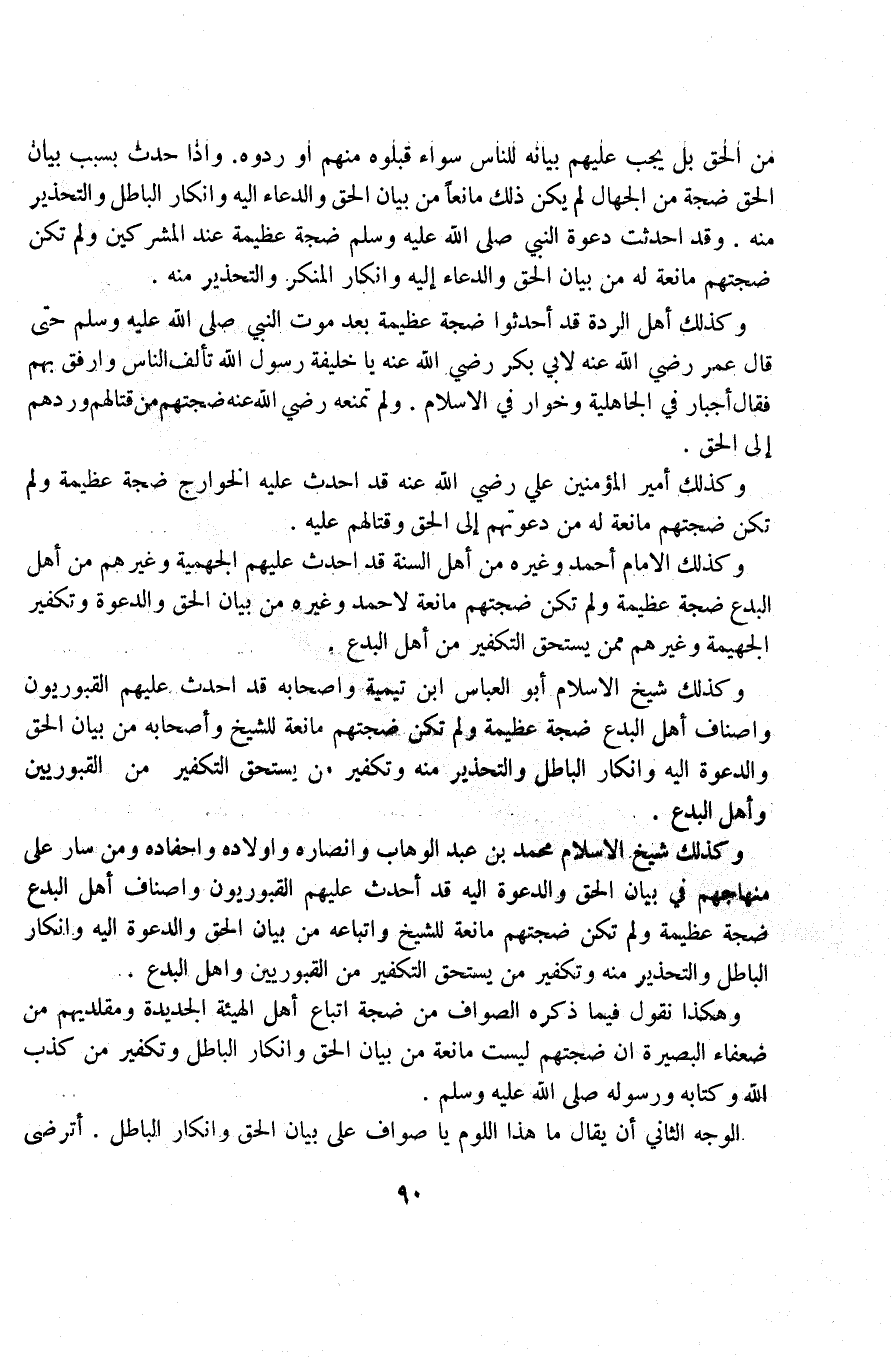 وكذلك شيخ الإسلام محمد بن عبد الوهاب وأنصاره وأولاده وأحفاده ومن سار على منهاجهم في بيان الحق والدعوة إليه قد أحدث عليهم القبوريون وأصناف أهل البدع ضجة عظيمة ولم تكن ضجتهم مانعة للشيخ وأتباعه من بيان الحق والدعوة إليه وإنكار الباطل والتحذير منه وتكفير من يستحق التكفير من القبوريين وأهل البدع.