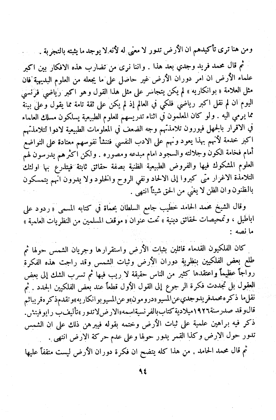 كان الفلكيون القدماء قائلين بثبات الأرض واستقرارها وجريان الشمس حولها ثم طلع بعض الفلكيين بنظرية دوران الأرض وثبات الشمس وقد راجت هذه الفكرة رواجاً عظيماً واعتقدها كثير من الناس حقيقة لا ريب فيها ثم تسرب الشك فيها إلى بعض العقول بل تجددت فكرة الرجوع إلى القول الأول قطعاً عند بعض الفلكيين الجدد. ثم نقل ما ذكر محمد فريد وجدي عن المسيو «درومون» وعن المسيوبو انكاريه» وتقدم ذكره قريبا ثم قال وقد صدر سنة 1926 ميلادية كتاب بالفرنسية اسمه «الأرض لا تدور» تأليف ب رايوفيتش. ذكر فيه براهين علمية على ثبات الأرض وختمه بقوله فيبرهن ذلك على أن الشمس تدور حول الأرض وكذا القمر يدور حولها وعلى عدم حركة الأرض انتهى.