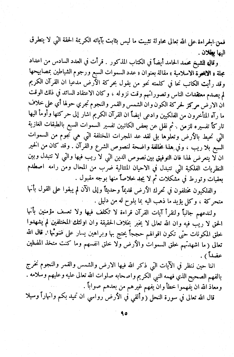 وقال الشيخ محمد الحامد أيضاً في الكتاب المذكور. قرأت في العدد السادس من أعداد مجلة «الأخوة الإسلامية» مقالة بعنوان «عدد السموات السبع ورجوم الشياطين بمصابيحها وقد رأيت الكاتب نحا ف بكلمته نحو من يقول بحركة الأرض مدعيا أن القرآن الكريم لم يصدم معتقدات الناس وتصوراتهم وقت نزوله, وكان الاعتقاد السائد في ذلك الوقت أن الأرض مركز لحركة الكون وأن الشمس والقمر والنجوم تجري حولها أي على خلاف ما رآه المتأخرون من الفلكيين وادعى أيضاً أن القرآن الكريم أشار إلى حركتها وأومأ إليها تاركاً تفسيره للزمن. ثم نقل عن بعض الكاتبين تفسير السموات السبع بالطبقات الغازية التي تحيط بالأرض وتعلوها بل لقد عد المجرات المختلفة التي هي نجوم من السموات السبع بلا ريب, وفي هذا مخالفة واضحة لنصوص الشرع والقرآن. وقد كان من الخير أن لا يتعرض لهذا فإن التوفيق بين نصوص الدين التي لا ريب فيها والتي لا تتبدل وبين النظريات الفلكية التي تتبدل في الأحيان المتتالية ضرب من المحال ومن رامه اصطدم بعقبات وتورط في مشكلات ثم لا يجد خلاصاً منها بوجه مقبول.