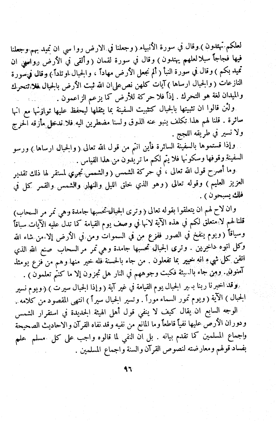 لعلكم تهتدون) وقال في سورة الأنبياء (وجعلنا في الأرض رواسي أن تميد بهم وجعلنا فيها فجاجاً سبلا لعلهم يهتدون) وقال في سورة لقمان (وألقى في الأرض رواسي أن تميد بكم) وقال في سورة النبأ (ألم نجعل الأرض مهاداً, والجبال أوتاداً) وقال في سورة النازعات (والجبال أرساها) آيات كلهن نص على أن الله ثبت الأرض بالجبال فلا تتحرك والميدان لغة هو التحرك. إذاً فلا حركة للأرض كما يزعم الزاعمون.
