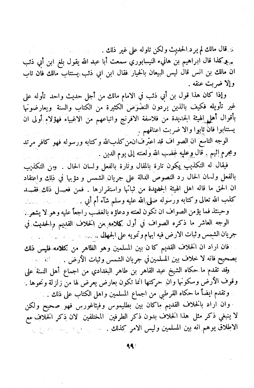 وإذا كان هذا قول ابن أبي ذئب في الإمام مالك من أجل حديث واحد تأوله على غير تأويله فكيف بالذين يردون النصوص الكثيرة من الكتاب والسنة ويعارضونها بأقوال أهل الهيئة الجديدة من فلاسفة الإفرنج وأتباعهم من الأغبياء فهؤلاء أولى أن يستتابوا فإن تابوا وإلا ضربت أعناقهم.