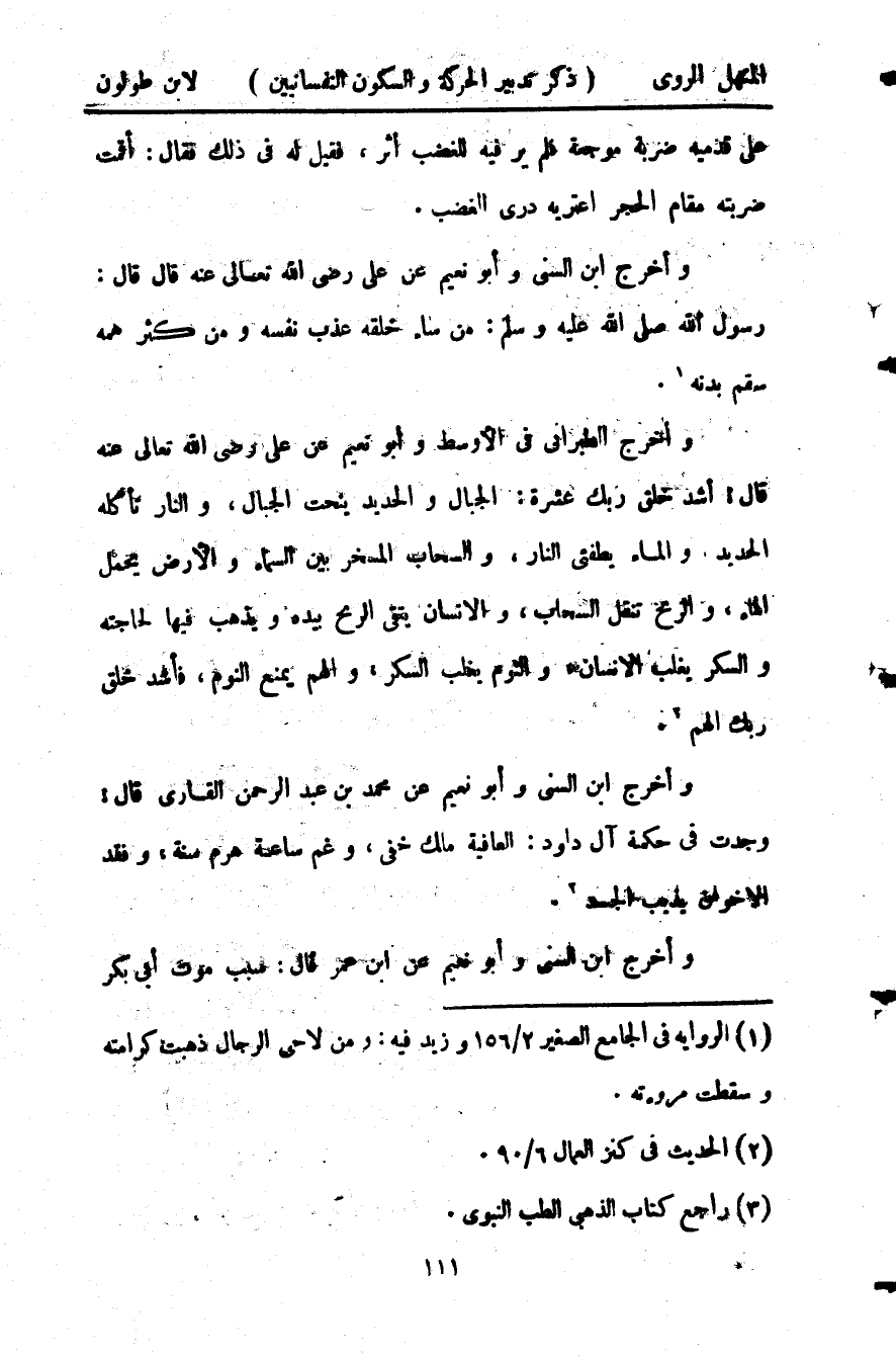 وأخرج ابن عساكر في تاريخه عن عبد الله بن بريدة قال: ينبغي للرجل أن يتعاهد من نفسه ثلاثاً: ينبغي أن لا يدع المشي فإن احتاج إليه يوماً: يقدر عليه, وينبغي أن لا يدع الأكل: فإن أمعاءه تنطبق.