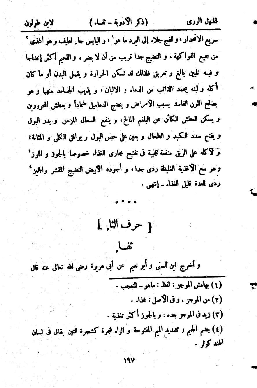 وقال ابن السني: هو الكمون الكرماني، وقال ابن الأعرابي: هو حب شبه الكمون وليس به وقال غيره: هو الرازيانج، قال الموفق: إذا كان المراد به الشبت أو الكمون أو الرازيانج فمنافع كل من هذه ظاهرة غزيرة، وكان معناه العسل في زقاق السمن فيمكن أن يقصد به ما يكتب من الرطوبة والدهانة السناء أحسن إصلاحه، وكان نظير ما نعمله اليوم من السكر ودهن اللوز مع طبيخ السناء.