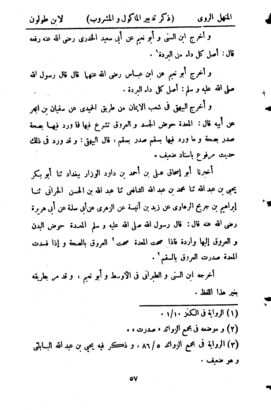 قال: اجتمع من أهل الطب عند ملك من الملوك فسألهم ما هو أس دواء المعدة، فقال: كل رجل منهم قولاً وفيهم رجل سكات، فلما فرغوا قال: ما تقول أنت؟ قال: ذكروا أشياء وكلها تنفع بعض النفع، ولكن ملاك ذلك ثلاثة أشياء: تأكل طعاماً أبداً حتى تمضغها مضغاً شديداً لا يكون على المعدة فيها المؤنة وأخرج البيهقي عن إبراهيم الذهلي قال.