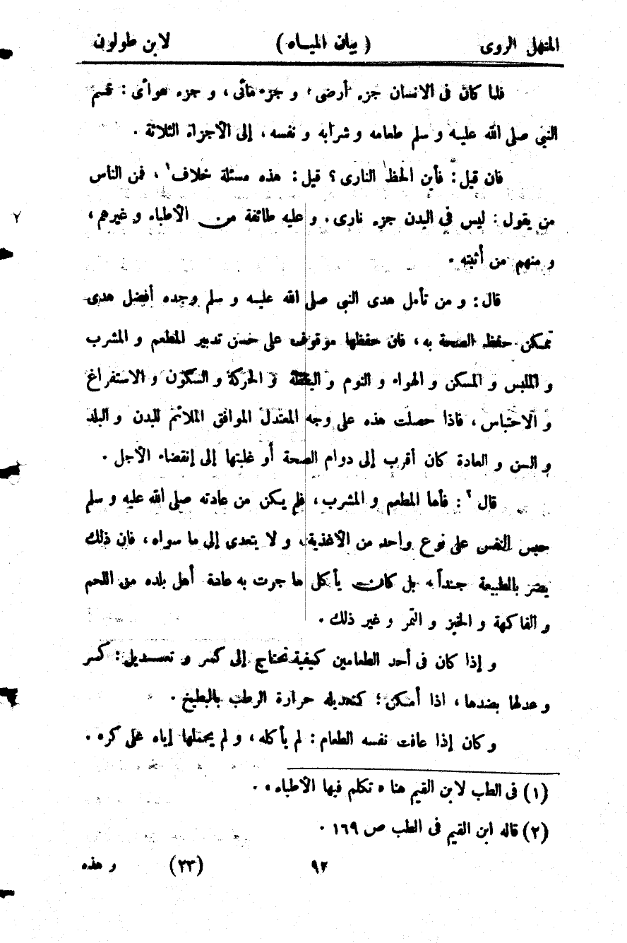 ولا يشرب الماء عقيب أخذ الطعام. ولا في خلله، ولا سيما الحار وعلى الحلو، وعقيب الفاكهة، والحلوى، والجماع، والحمام، ولا يجمع بين ماء البئر وماء النهر، ولا يعب الماء عباً فإن الكباد –وهو وجع الكبد- من العب – وهو جرع الماء جرعاً كباراً.