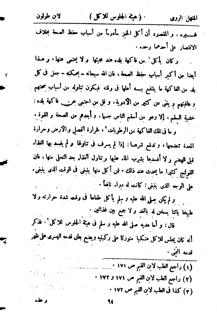 ثم قال: عن تدبير الحركة والسكون بقاء البدن بدون الغذاء محال، وليس غذاء بجملته يصير جزؤ عضو، بل لا بد أن يبقى منه عند كل هضم أثر ولطخه فإذا تركت وكثرت على طول الزمان اجتمع شيء له قدر، يضر بكمية: بأن يسخن [البدن] بنفسه، أو بالعفن، أو يبرد بنفسه، أو بإطفاء الحرارة [الغريزية] أو بكمية: بأن يسد ويثقل البدن، ويوجب أمراض الاحتباس وإن استفرغت تأذي البدن بالأدوية لأن كثرة سمية، لا تخلو من إخراج الصالح. فهذه الفضلات ضارة تركت أو استفرغت والحركة أقوى الأسباب في منع تولدها: بما يسخن الأعضاء ويسيل فضلاتها: فلا تجتمع على طول الزمان: وهي تعود البدن الخفة والنشاط، وتجعله قابلاً للغذاء وتصلب المفاصل، وتقوي الأوتار والرباطات [والأعصاب] وتؤمن من جميع الأمراض المادية، وأكثر المزاجية إذا استعملت المعتدلة منها في وقتها، وكان باقي التدبير صواباً.