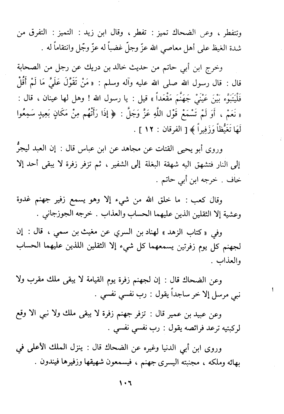 وعن الضحاك قال: إن لجهنم زفرة يوم القيامة، لا يبقى ملك مقرب، ولا نبي مرسل، إلا خر ساجداً، يقول: رب نفسي نفسي.