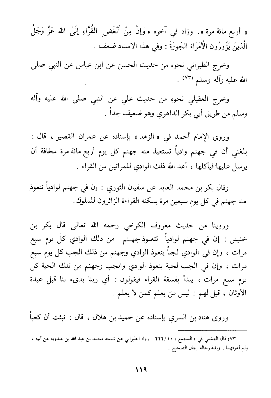 وروينا من حديث معروف الكرخي، رحمه الله تعالى، قال بكر بن خنيس: إن في جهنم لوادياً تتعوذ جهنم من ذلك الوادي كل يوم سبع مرات، وإن في الوادي لجباً، يتعوذ الوادي وجهنم من ذلك الجب كل يوم سبع مرات، وإن في الجب لحية، يتعوذ الوادي والجب وجهنم من تلك الحية كل يوم سبع مرات، يبدأ بفسقة القراء فيقولون: أي ربنا بدئ بنا قبل عبدة الأوثان؟ ! قيل لهم: ليس من يعلم كمن لا يعلم.