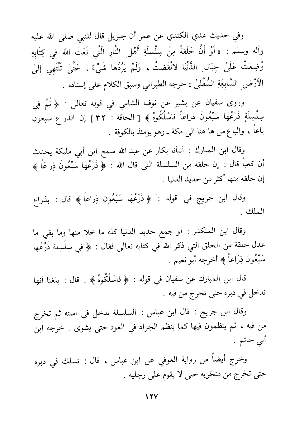 وقال ابن المنكدر: لو جمع حديد الدنيا كله، ما خلا منها وما بقي، ما عدل حلقة من الحلق التي ذكر الله في كتابه تعالى فقال: {في سلسلة ذرعها سبعون ذراعاً} أخرجه أبو نعيم.