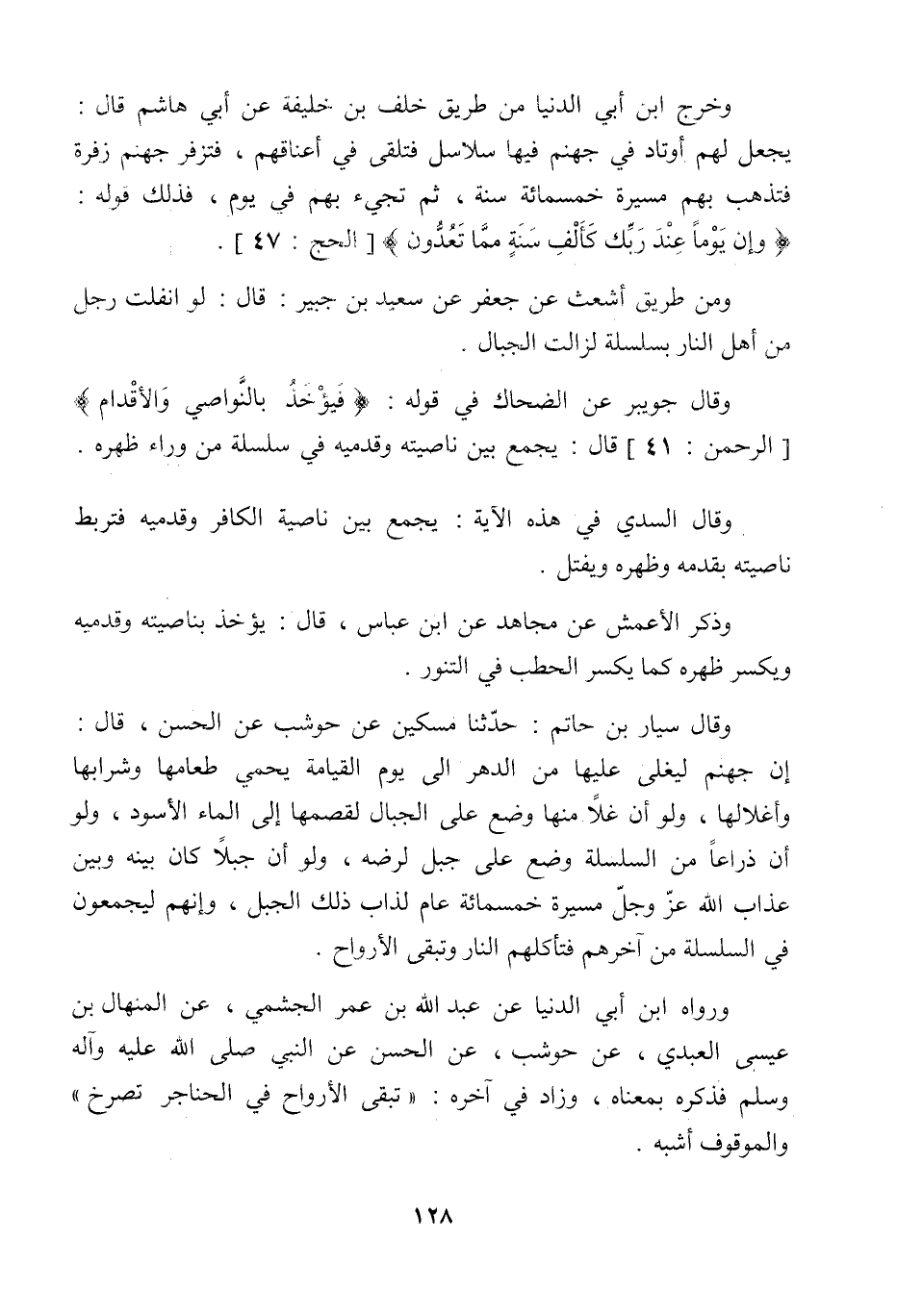ومن طريق أشعث، عن جعفر، عن سعيد بن جبير، قال: لو انفلت رجل من أهل النار بسلسلة لزالت الجبال.