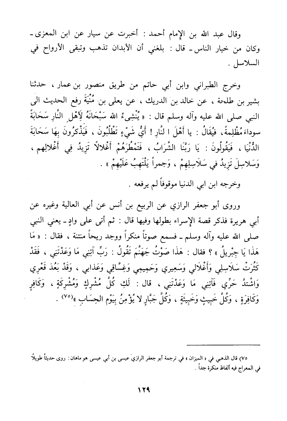 وقال عبد الله بن الإمام أحمد: أخبرت عن يسار، عن ابن المعزى ـ وكان من خيار الناس ـ قال: بلغني أن الأبدان تذهب وتبقى الأرواح في السلاسل.