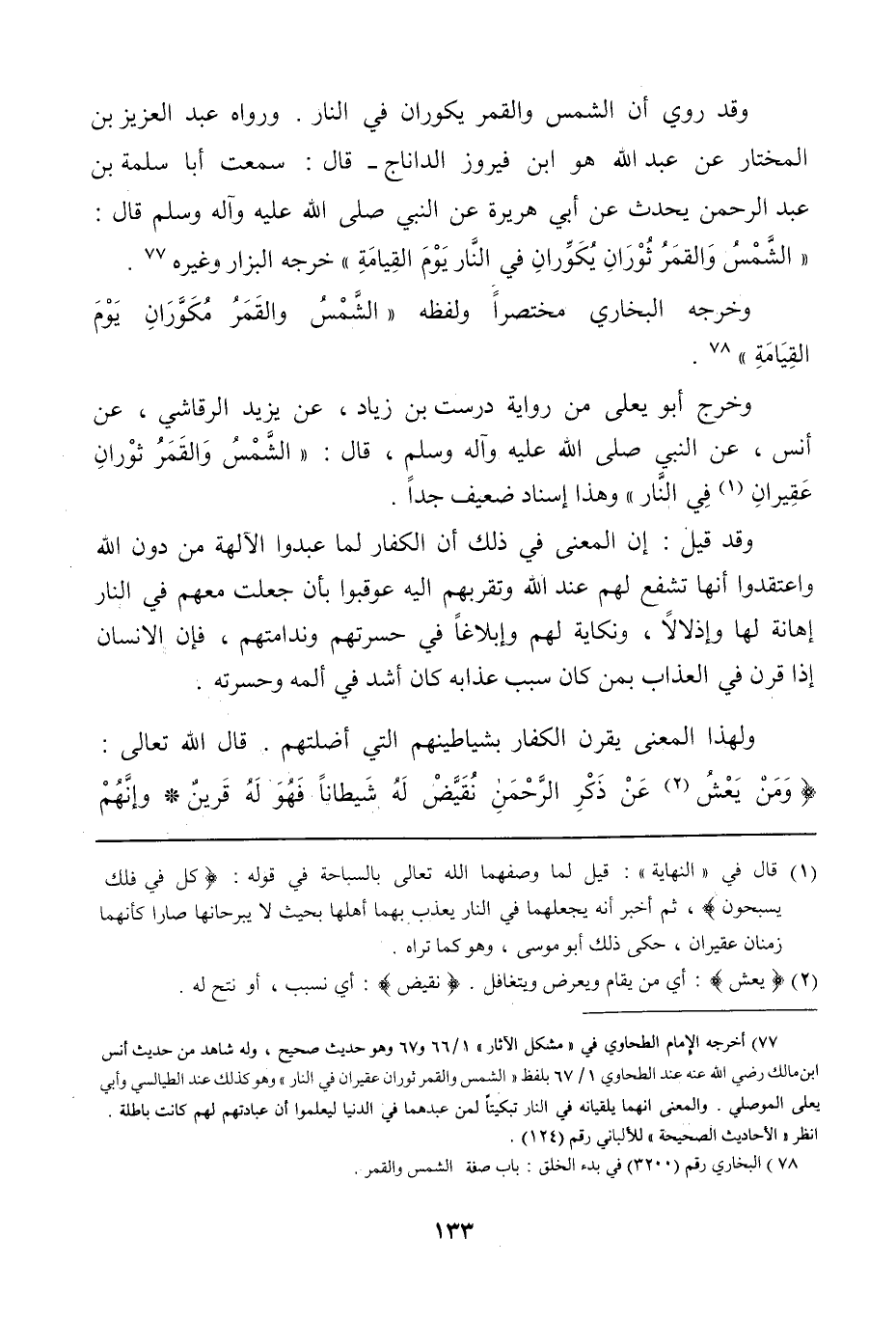 وخرج أبو يعلى، من رواية درست بن زياد، «عن يزيد الرشاقي، عن أنس، عن النبي صلى الله عليه وآله وسلم، قال: الشمس والقمر ثوران عقيران في النار» وهذا إسناد ضعيف جداً.