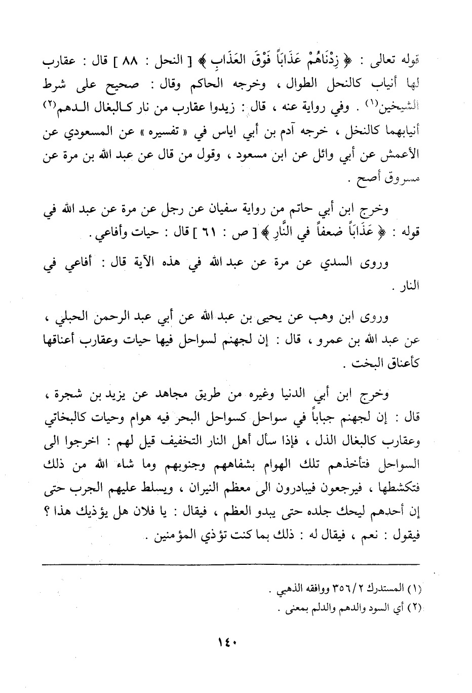 وروى ابن وهب، عن يحيى بن عبد الله، عن أبي عبد الرحمن الحبلي، عن عبد الله بن عمرو، قال: إن لجهنم لسواحل فيها حيات وعقارب، أعناقها كأعناق البخت.