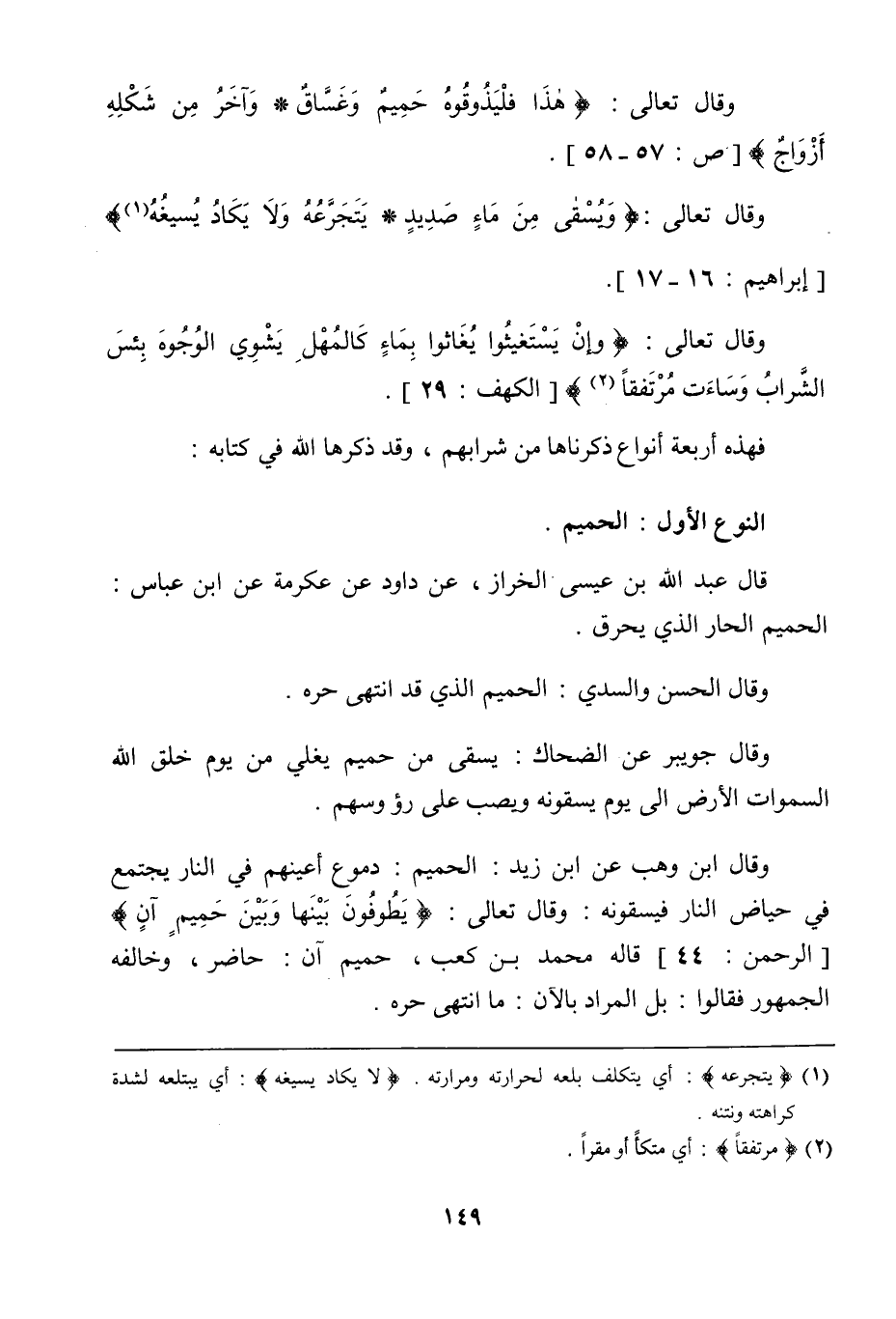 النوع الأول: الحميم ـ قال عبد الله بن عيسى الخراز، عن داود، عن عكرمة، عن ابن عباس: الحميم: الحار الذي يحرق.