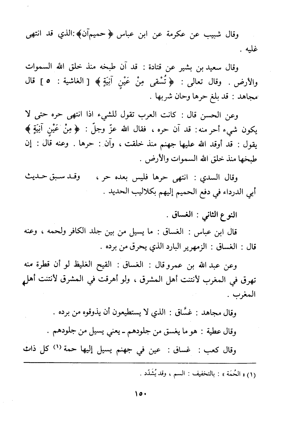 النوع الثاني: الغساق ـ قال ابن عباس: الغساق: ما يسيل من بين جلد الكافر ولحمه.