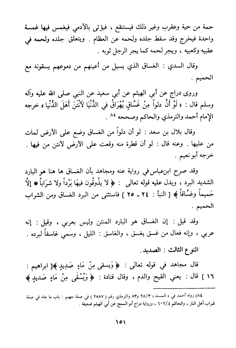 وروى دراج، «عن أبي الهيثم، عن أبي سعيد، عن النبي صلى الله عليه وآله وسلم، قال: لو أن دلواً من غساق، يهرق في الدنيا، لأنتن أهل الدنيا» خرجه الإمام أحمد والترمذي والحاكم وصححه.