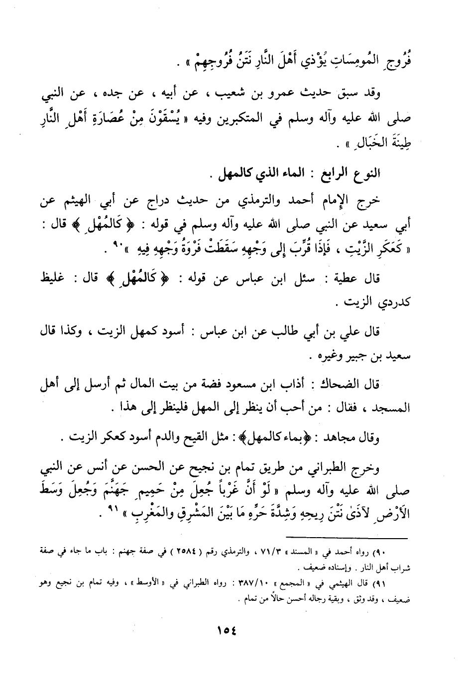 النوع الرابع: الماء الذي كالمهل: خرج الإمام أحمد والترمذي، «من حديث دراج، عن أبي الهيثم، عن أبي سعيد، عن النبي صلى الله عليه وآله وسلم، في قوله: كالمهل قال: كعكر الزيت، فإذا قرب إلى وجهه، سقطت فروة وجهه فيه» .