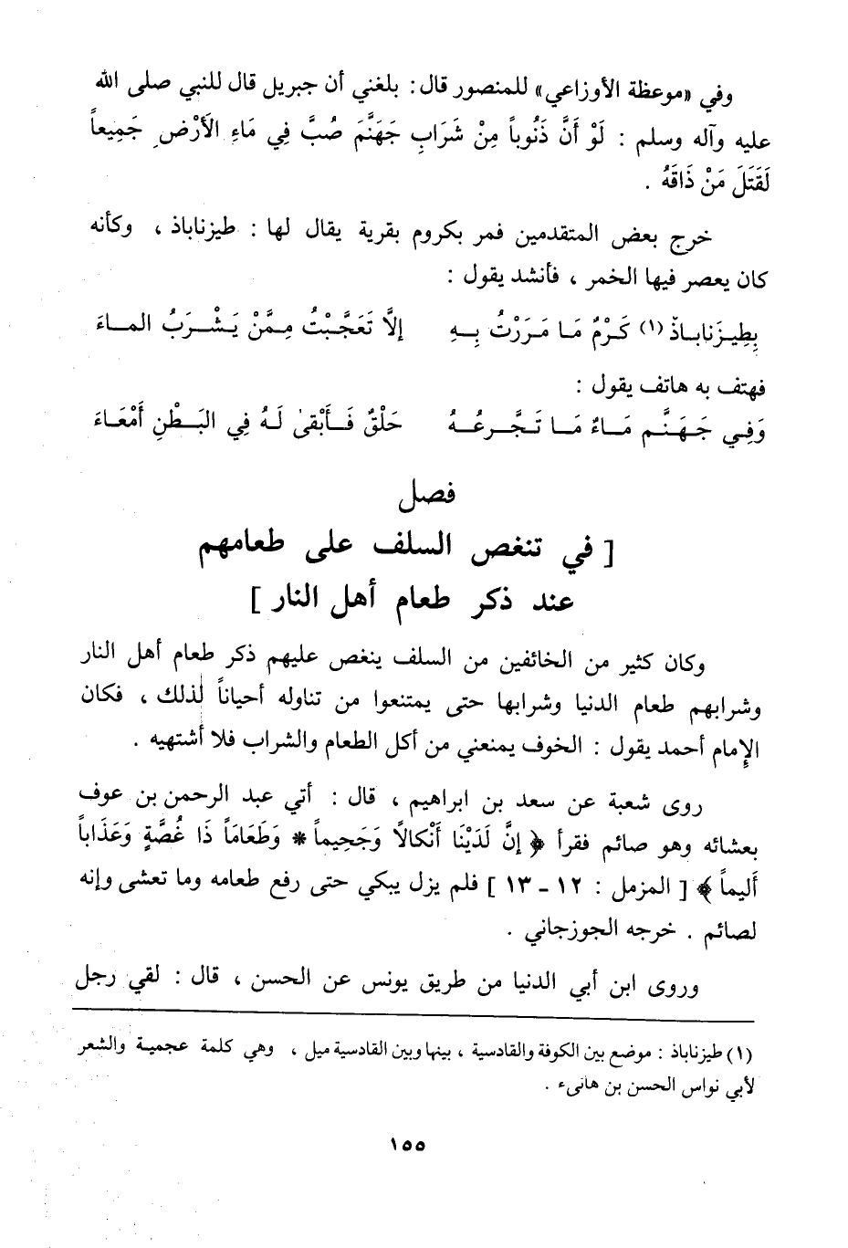 وكان كثير من الخائفين من السلف، ينغص عليهم ذكر طعام أهل النار وشرابهم، طعام الدنيا وشرابها، حتى يمتنعوا من تناوله أحياناً لذلك، فكان الإمام أحمد يقول: الخوف يمنعني من أكل الطعام والشراب فلا أشتهيه.