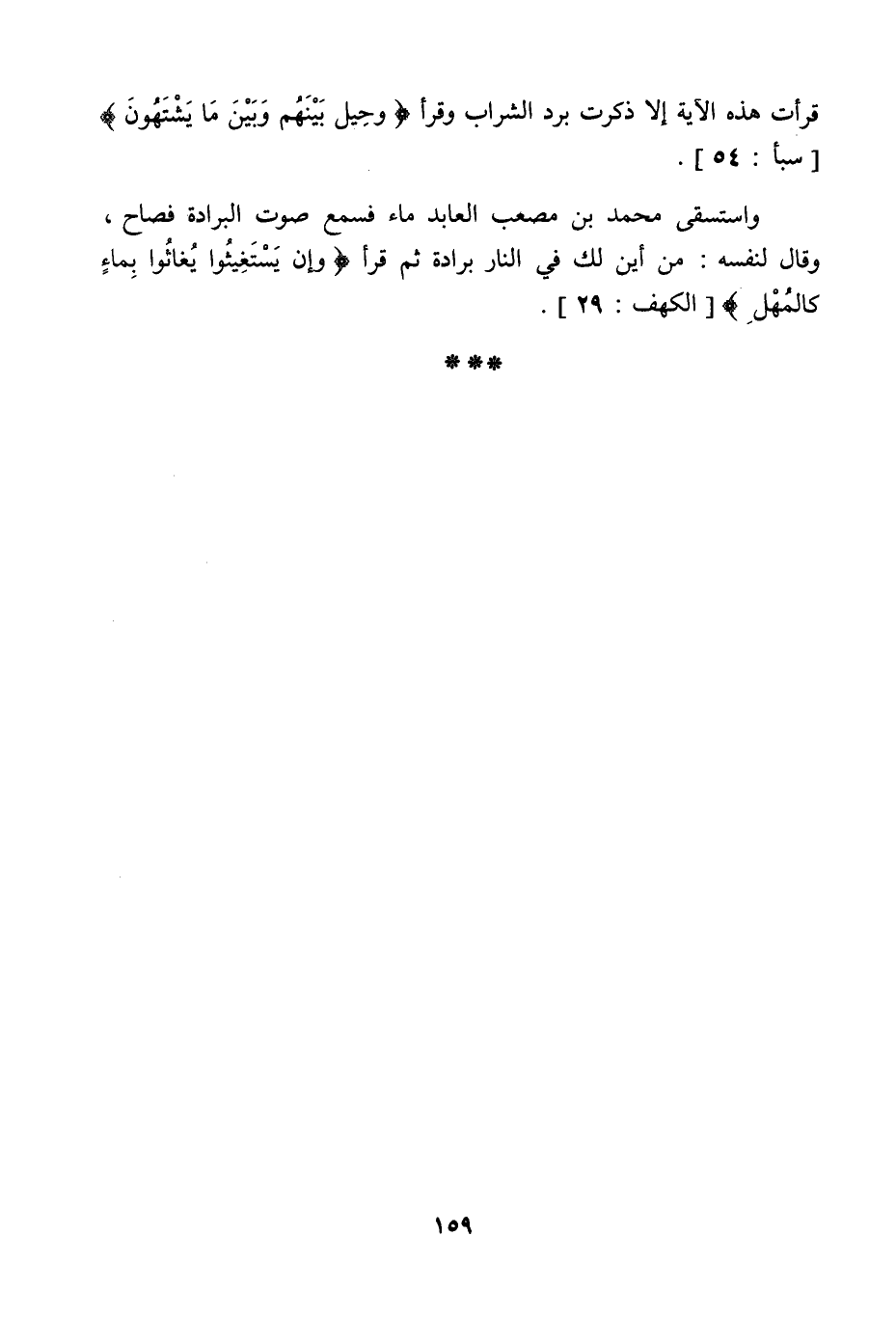 واستقى محمد بن مصعب العابد ماء، فسمع صوت البرادة، فصاح، وقال لنفسه: من أين لك في النار برادة ثم قرأ:
