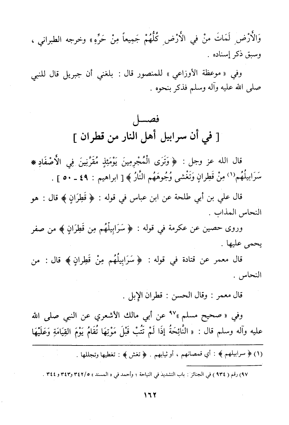 وفي صحيح مسلم «عن أبي مالك الأشعري، عن النبي صلى الله عليه وآله وسلم قال: النائحة إذا لم تتب قبل موتها، تقام يوم القيامة، وعليها سربال من قطران، ودرعه من جرب» .