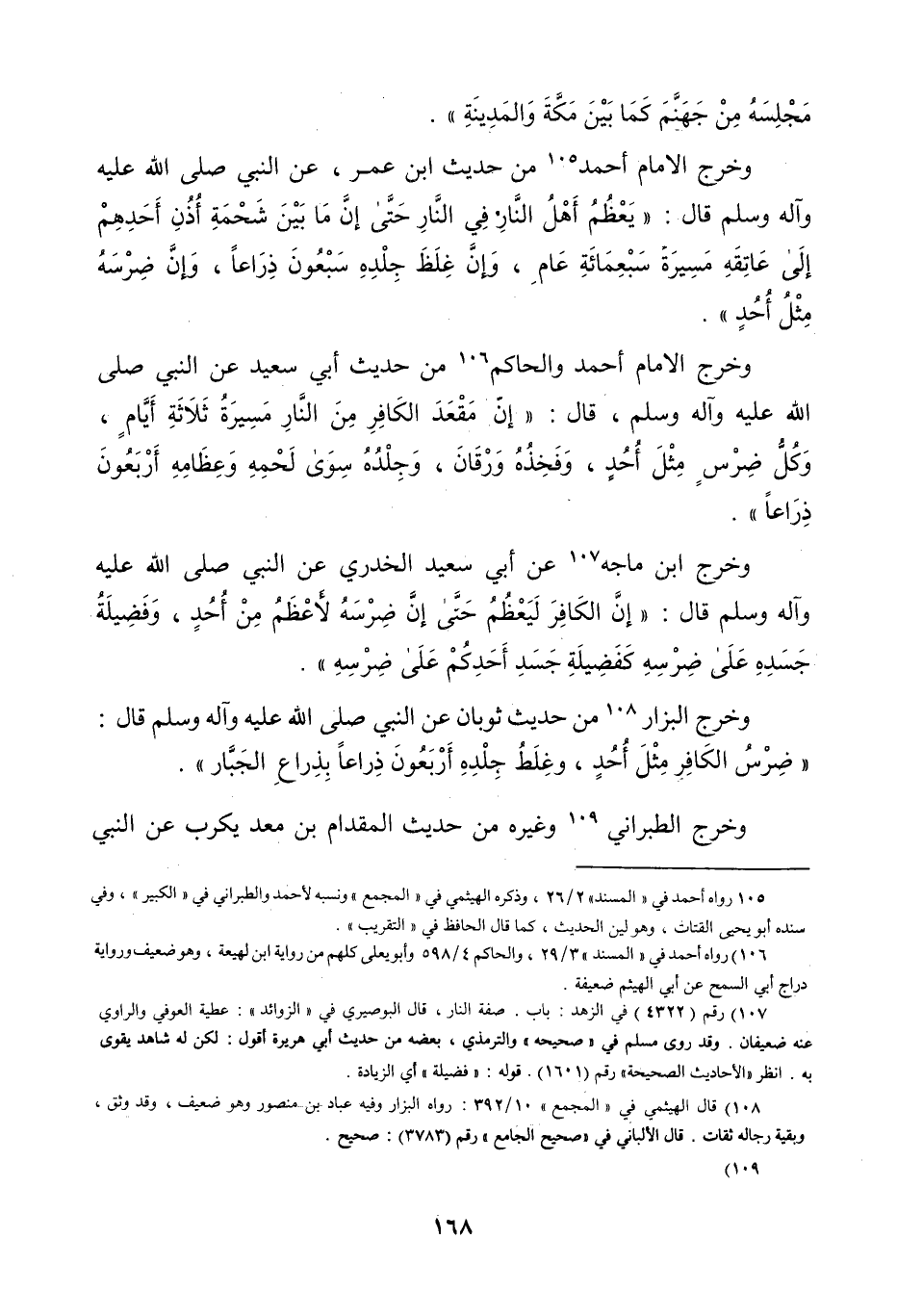 وخرج الإمام أحمد والحاكم، «من حديث أبي سعيد عن النبي صلى الله عليه وآله وسلم، قال: إن مقعد الكافر من النار مسيرة ثلاثة أيام، وكل ضرس مثل أحد، وفخذه مثل ورقان، وجلده لحمه وعظامه أربعون ذراعاً» .