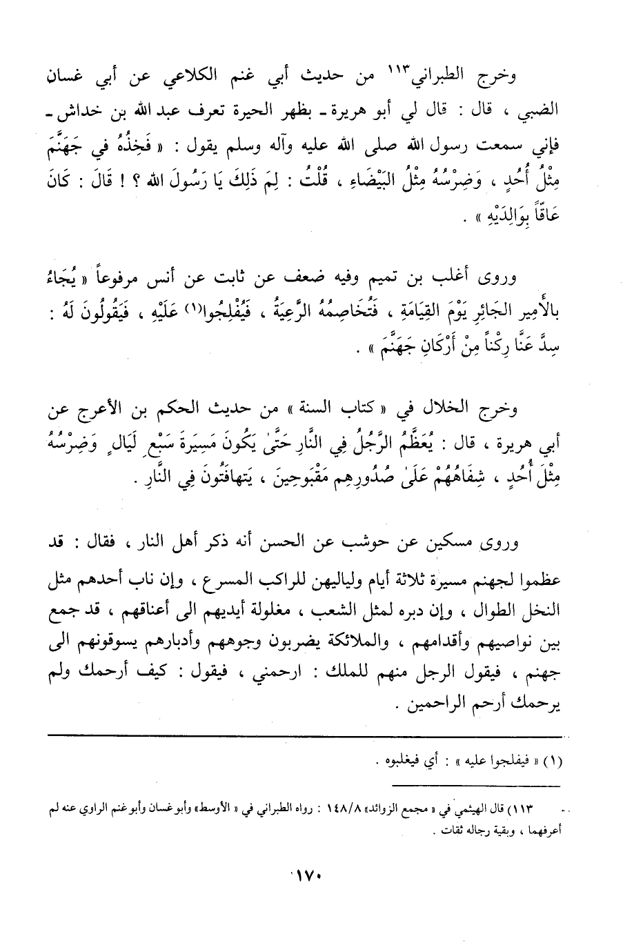 وخرج الطبراني «من حديث أبي غنم الكلاعي، عن أبي غسان الضبي، قال: قال لي أبو هريرة ـ بظهر الحيرة تعرف عبد الله بن خداش ـ فإني سمعت رسول الله صلى الله عليه وآله وسلم يقول: فخذه في جهنم مثل أحد، وضرسه مثل البيضاء، قلت: لم ذلك يا رسول الله؟ ! قال: كان عاقاً بوالديه» .