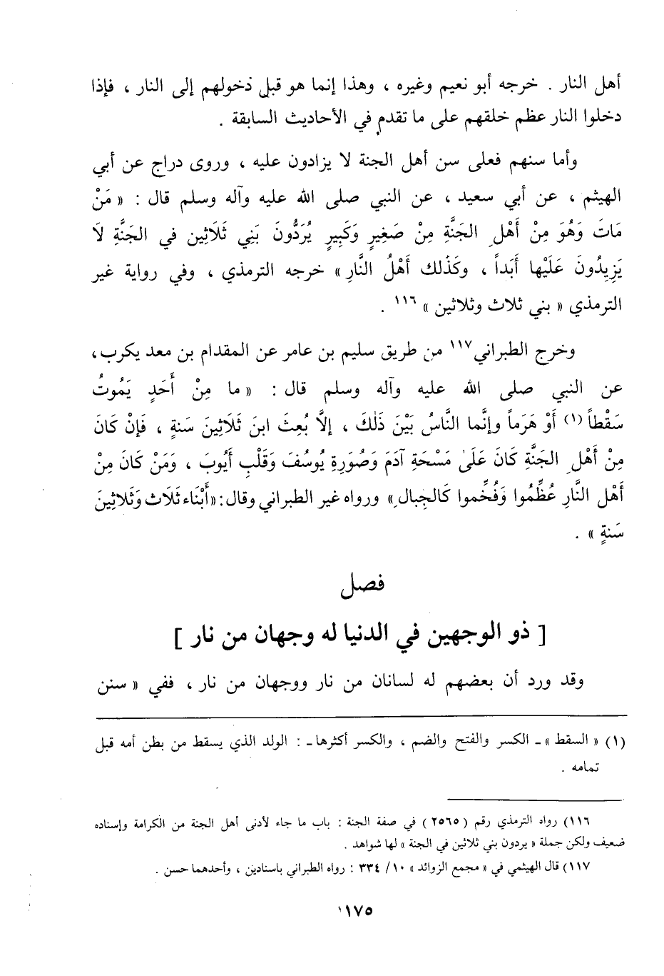 وخرج الطبراني، «من طريق سليم بن عامر، عن المقدام بن معد يكرب، عن النبي صلى الله عليه وآله وسلم، قال: ما من أحد يموت سقطاً أو هرماً، وإنما الناس بين ذلك، إلا بعث ابن ثلاثين سنة، فإن كان من أهل الجنة، كان على مسحة آدم، وصورة يوسف، وقلب أيوب، ومن كان من أهل النار، عظموا وفخموا كالجبال» .