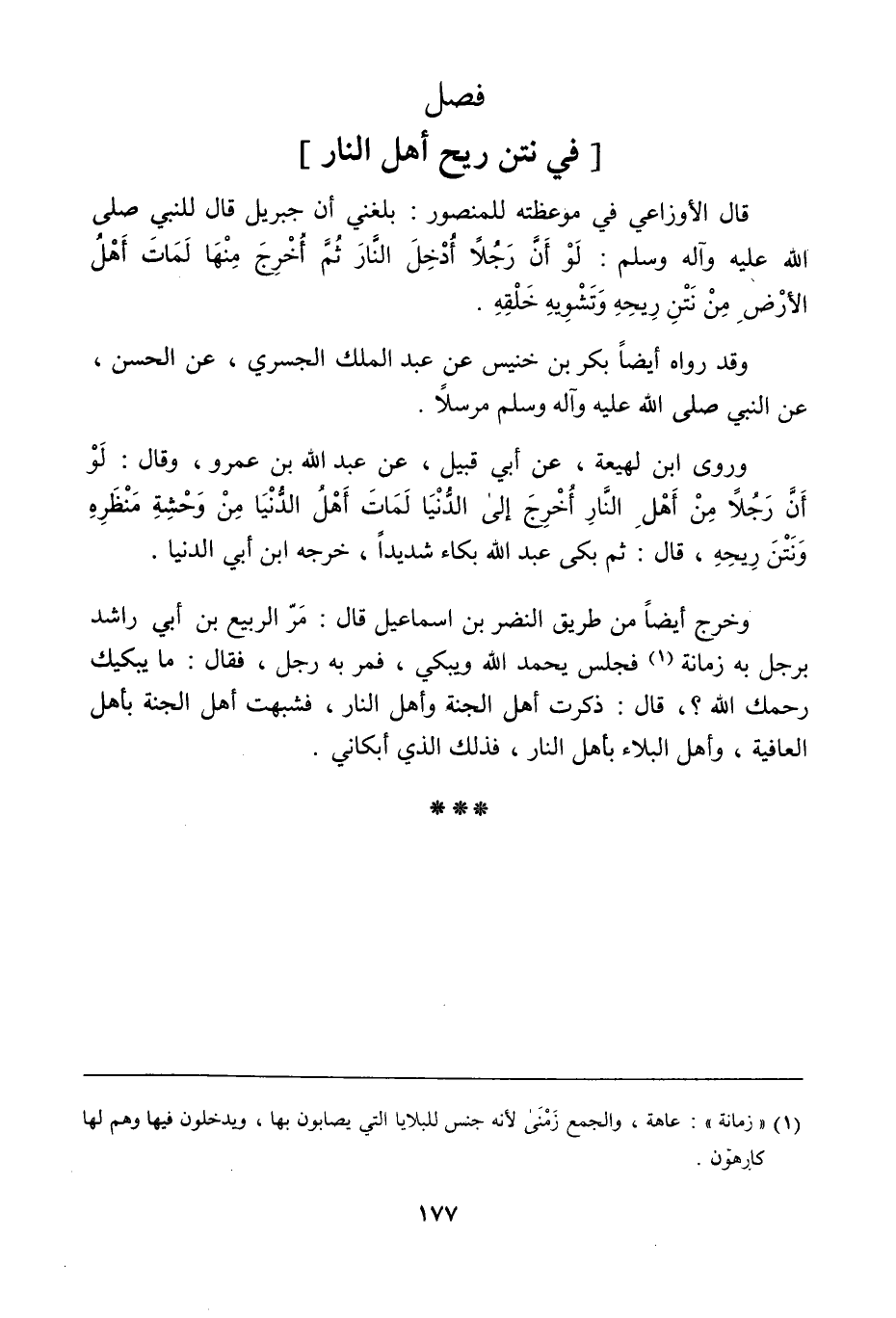 قال الأوزاعي في موعظته للمنصور: «بلغني أن جبريل قال للنبي صلى الله عليه وآله وسلم: لو أن رجلاً أدخل النار، ثم أخرج منها، لمات أهل الأرض من نتن ريحه وتشويه خلقه» ، وقد رواه أيضاً بكر بكر بن خنيس، عن عبد الملك الجسري، عن الحسن، عن النبي صلى الله عليه وآله وسلم مرسلاً.