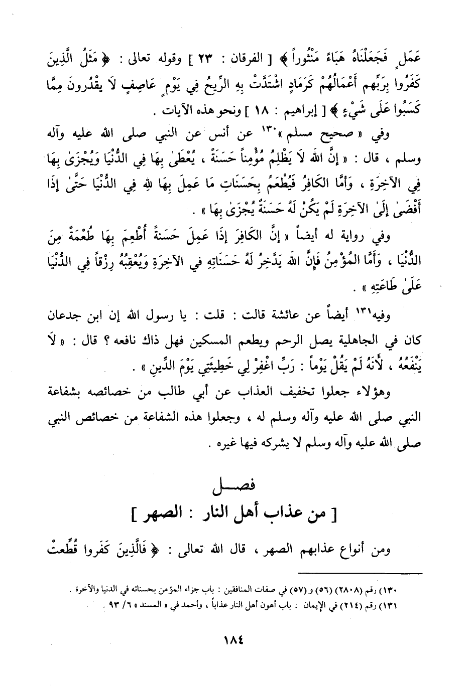 وفيه أيضاً: «عن عائشة، قالت: قلت: يا رسول الله، إن ابن جدعان كان في الجاهلية يصل الرحم، ويطعم المسكين، فهل ذاك نافعة؟ قال: لا ينفعه، لأنه لم يقل يوماً: رب اغفر لي خطيئتي يوم الدين» .