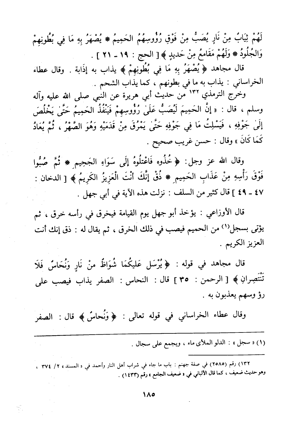 وخرج الترمذي، «من حديث أبي هريرة، عن النبي صلى الله عليه وآله وسلم، قال: إن الحميم ليصب على رؤوسهم، فينفذ الحميم حتى يخلص إلى جوفه، فيسلت ما في جوفه حتى يمرق من قدميه، وهو الصهر، ثم يعود كما كان» .
