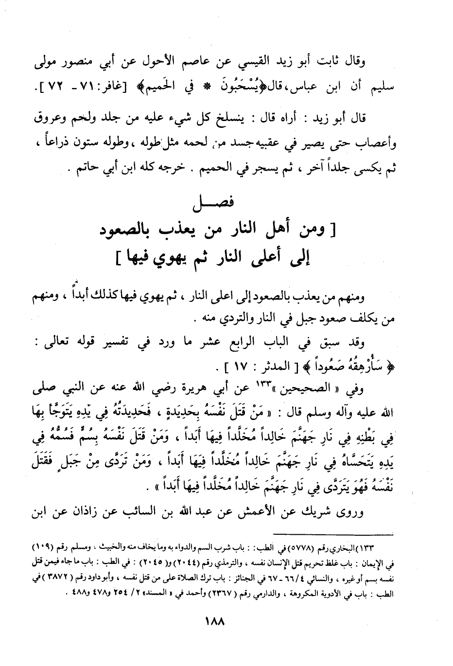 ومنهم من يعذب بالصعود إلى أعلى النار، ثم يهوي فيها كذلك أبداً، ومنهم من يكلف صعود جبل في النار والتردي منه، وقد سبق في الباب الرابع عشر، ما ورد في تفسير قوله تعالى: