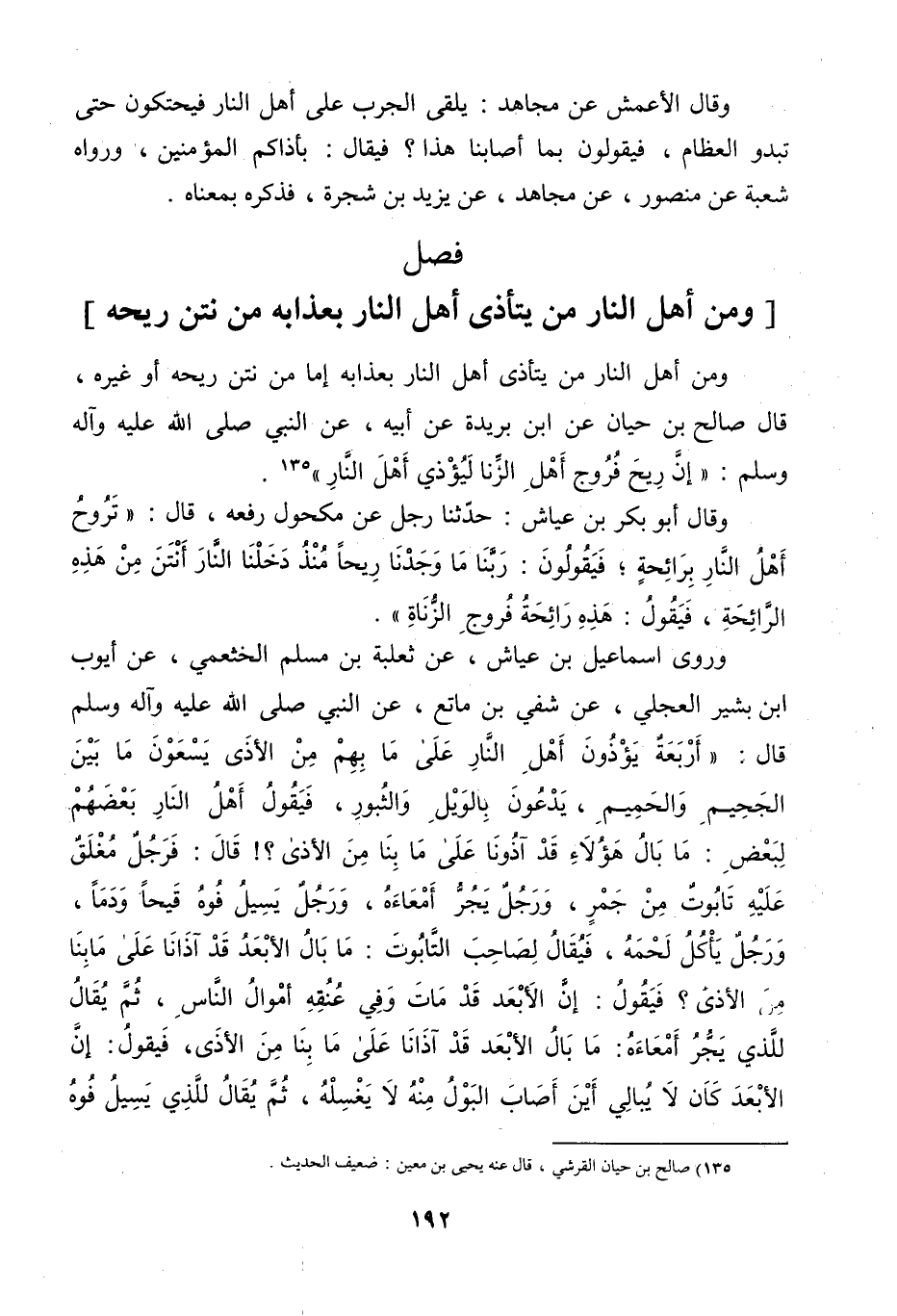ومن أهل النار من يتأذى أهل النار بعذابه، إما من نتن ريحه، أو غيره، قال صالح بن حيان، «عن ابن بريدة، عن أبيه، عن النبي صلى الله عليه وآله وسلم: إن ريح فروج أهل الزنا ليؤذي أهل النار» .