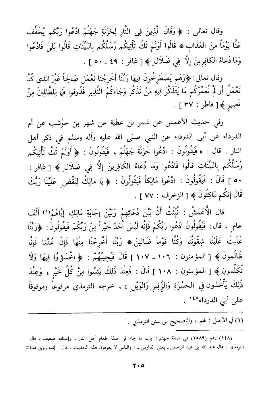 وفي حديث الأعمش، «عن شمر بن عطية، عن شهر بن حوشب، عن أم الدرداء، عن أبي الدرداء، عن النبي صلى الله عليه وآله وسلم، في ذكر أهل النار، قال: فيقولون: ادعوا خزنة جهنم، فيقولون: