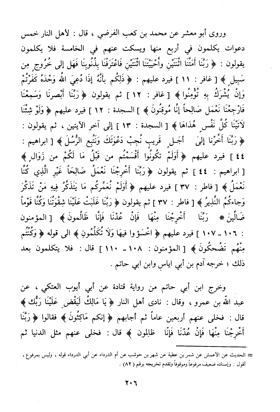 وخرج ابن أبي حاتم، من رواية قتادة، عن أبي أيوب العتكي، عن عبد الله ابن عمرو، وقال: نادى أهل النار {يا مالك ليقض علينا ربك} قال: فخلى عنهم أربعين عاماً، ثم أجابهم: {إنكم ماكثون} ، فقالوا: {ربنا أخرجنا منها فإن عدنا فإنا ظالمون} قال: فخلى عنهم مثل الدنيا، ثم
