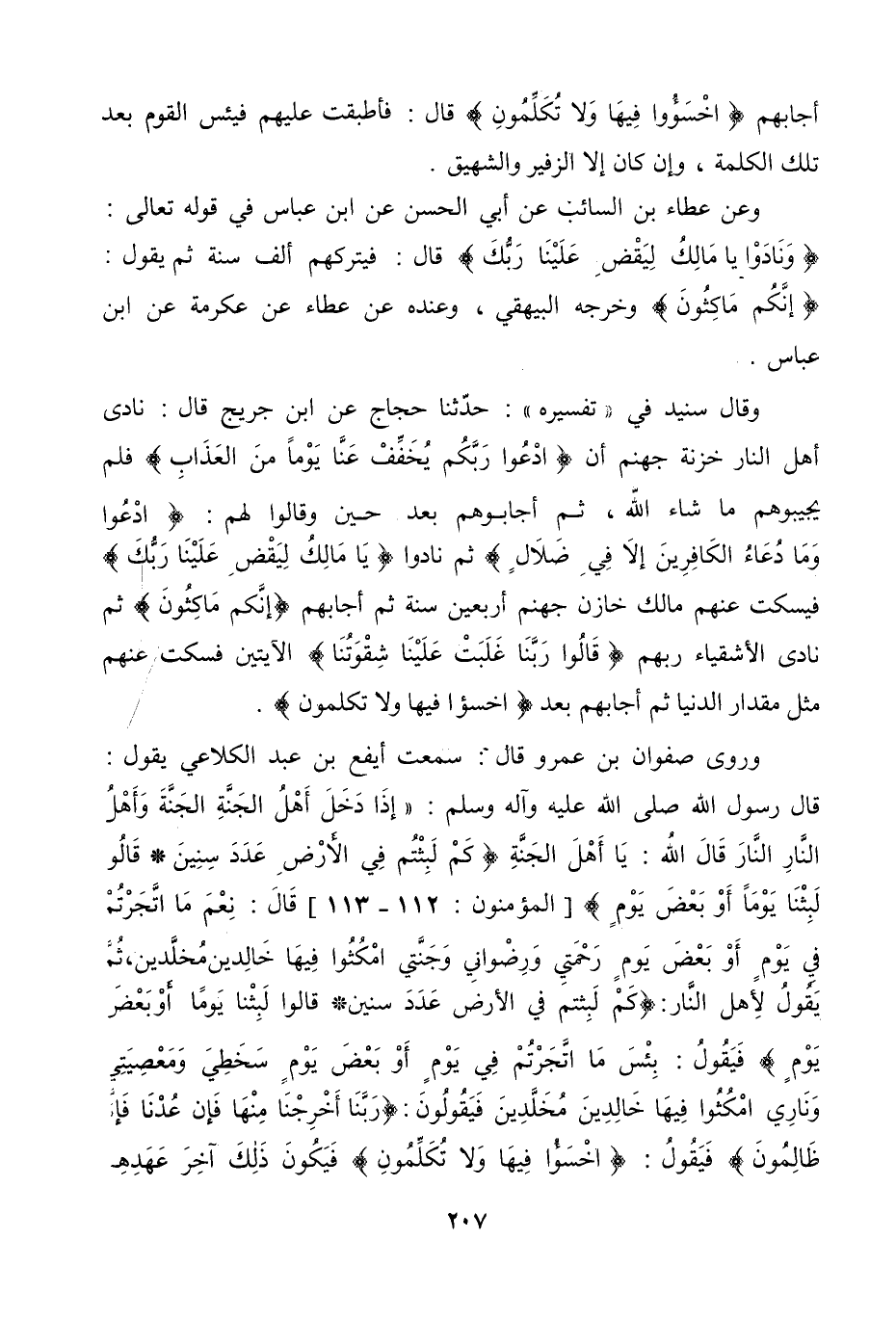 قال: نعم ما اتجرتم في يوم أو بعض يوم رحمتي ورضواني وجنتي، امكثوا فيها خالدين مخلدين، ثم يقول لأهل النار: {كم لبثتم في الأرض عدد سنين * قالوا لبثنا يوما أو بعض يوم} فيقول: بئس ما اتجرتم في يوم أو بعض يوم، سخطي، ومعصيتي، وناري، امكثوا فيها خالدين مخلدين، فيقولون: {ربنا أخرجنا منها فإن عدنا فإنا ظالمون} فيقول: {اخسؤوا فيها ولا تكلمون} فيكون ذلك آخر عهدهم