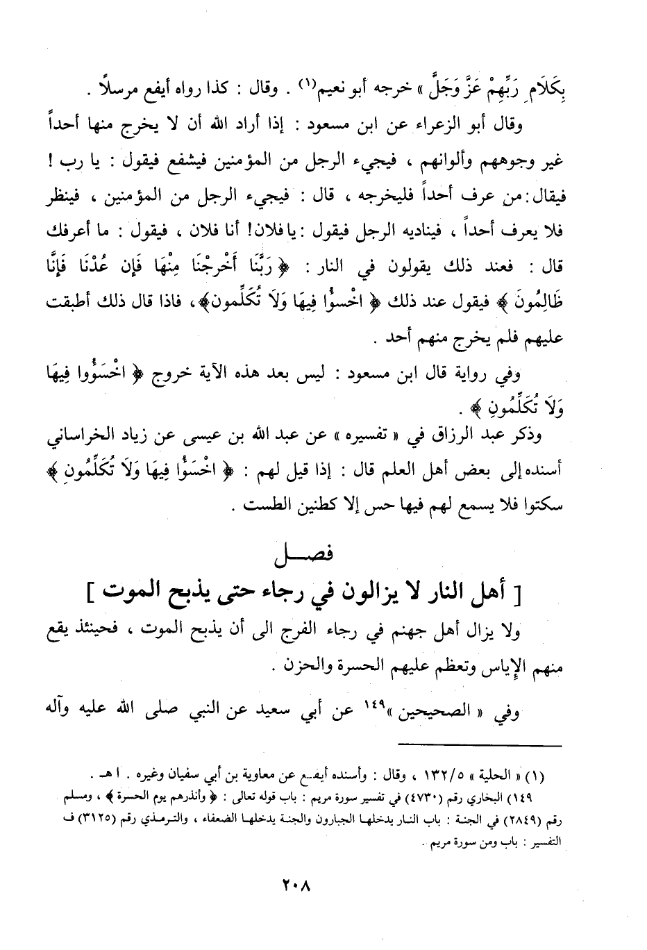 وقال أبو الزعراء، عن ابن مسعود: إذا أراد الله أن لا يخرج منها أحداً، غير وجوههم وألوانهم، فيجيء الرجل من المؤمنين، فيشفع، فيقول: يا رب، فيقال: من عرف أحداً فليخرجه، قال: فيجيء الرجل من المؤمنين، فينظر فلا يعرف أحداً، فيناديه الرجل فيقول: يا فلان أنا فلان، فيقول: ما أعرفك! قال: فعند ذلك يقولون في النار: {ربنا أخرجنا منها فإن عدنا فإنا ظالمون} فيقول عند ذلك: {اخسؤوا فيها ولا تكلمون} ، فإذا قال ذلك أطبقت عليهم، فلم يخرج منها أحد.