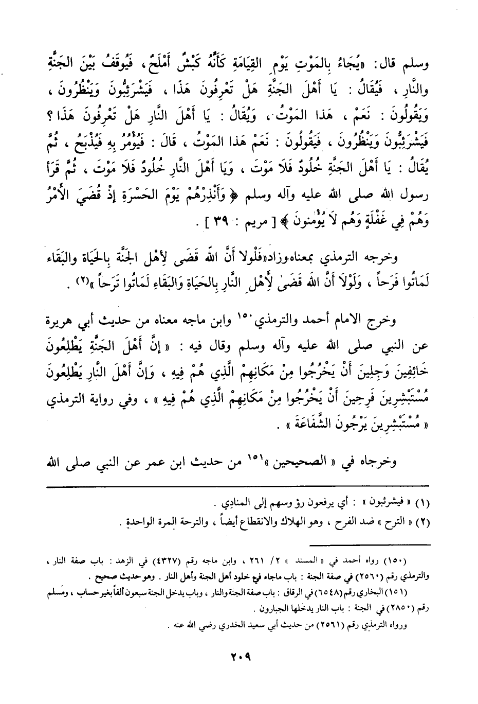 وخرجه الترمذي بمعناه وزاد «فلولا أن الله قضى لأهل الجنة بالحياة والبقاء، لماتوا فرحاً، ولولا أن الله قضى لأهل النار بالحياة والبقاء، لماتوا ترحاً» .