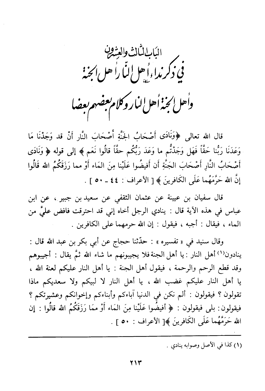 الباب الثالث والعشرون ـ في ذكر نداء أهل النار أهل الجنة، وأهل الجنة أهل النار وتكليم بعضهم بعضاً