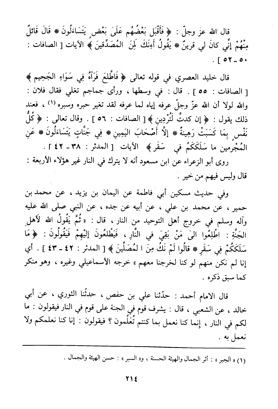 قال الإمام أحمد: حدثنا علي بن حفص، حدثنا الثوري، عن أبي خالد، عن الشعبي، قال: يشرف قوم في الجنة على قوم في النار، فيقولون ما لكم في النار، وإنما كنا نعمل بما كنتم تعلمون؟ فيقولون: إنا كنا نعلمكم ولا نعمل به.