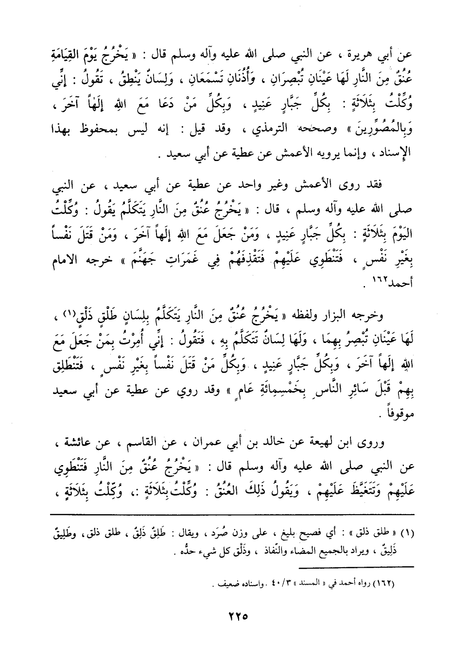 وقد قيل: إنه ليس بمحفوظ بهذا الإسناد، وإنما يرويه الأعمش، «عن عطية، عن أبي سعيد وغير واحد عن عطية، عن أبي سعيد، عن النبي صَلَّى اللهُ عَلَيْهِ وَآلِهِ وَسَلَّمَ، قال: يخرج عنق من النار يتكلم، يقول: وكلت اليوم بثلاثة: بكل جبار عنيد، ومن جعل مع الله إلهاً آخر، ومن قتل نفساً بغير نفس، فتنطوي عليهم، فتقذفهم في غمرات جهنم» .