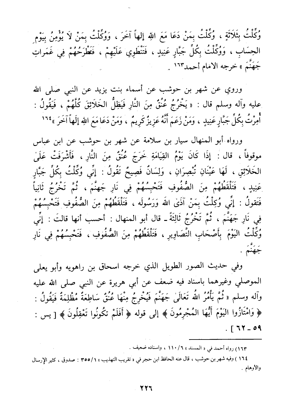 وروي «عن شهر بن حوشب عن أسماء بنت يزيد، عن النبي صَلَّى اللهُ عَلَيْهِ وَآلِهِ وَسَلَّمَ، قال: يخرج عنق من النار، فيظل الخلائق كلهم، فيقول: أمرت بكل جبار عنيد، ومن زعم أنه عزيز كريم، ومن دعا مع الله إلهاً آخر» .