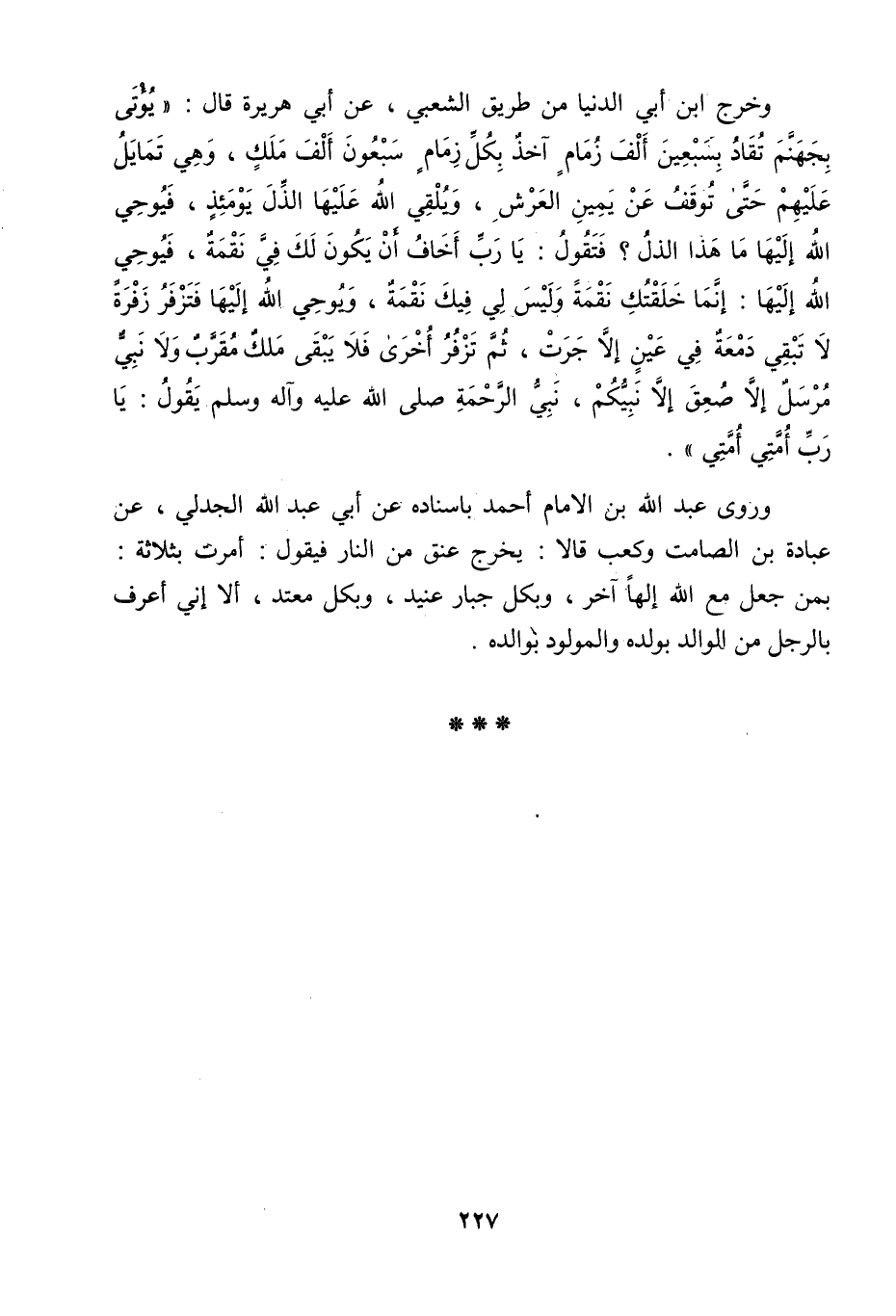 وخرج ابن أبي الدنيا، من طريق الشعبي، عن أبي هريرة قال: يؤتى بجهنم، تقاد بسبعين ألف زمام، آخذ بكل زمام سبعون ألف ملك، وهي تمايل عليهم، حتى توقف عن يمين العرش، ويلقي الله عليها الذل يومئذ، فيوحي الله إليها: ما هذا الذل؟ فيقول: يا رب، أخاف أن يكون لك في نقمة، فيوحي الله إليها: إنما خلقتك نقمة، وليس لي فيك نقمة، ويوحي الله إليها، فتزفر زفرة، لا تبقى دمعة في عين إلا جرت، ثم تزفر أخرى فلا يبقى ملك مقرب، ولا نبي مرسل، إلا صعق، إلا نبيكم نبي الرحمة صَلَّى اللهُ عَلَيْهِ وَآلِهِ وَسَلَّمَ، يقول: يا رب أمتي أمتي.
