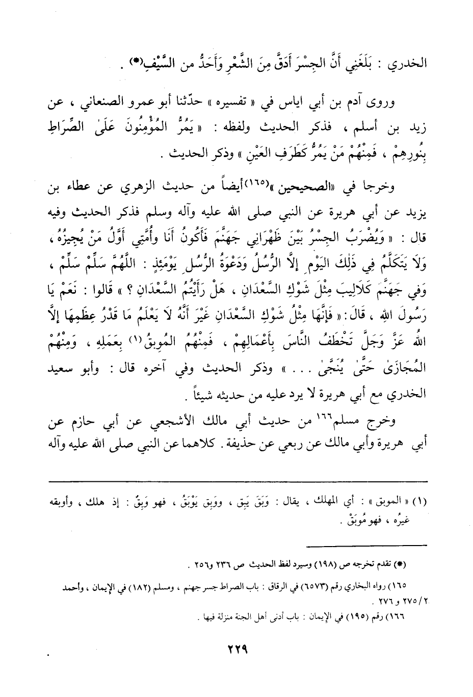 وخرجا في الصحيحين أيضاً، «من حديث الزهري، عن عطاء بن يزيد، عن أبي هريرة، عن النبي صَلَّى اللهُ عَلَيْهِ وَآلِهِ وَسَلَّمَ، فذكر الحديث، وفيه قال: ويضرب الجسر بين ظهراني جهنم، فأكون أنا وأمتي أول من يجيزه، ولا يتلكم في ذلك اليوم إلا الرسل، ودعوة الرسل يومئذ: اللهم سلم سلم، وفي جهنم كلاليب مثل شوك السعدان، هل رأيتم السعدان؟ قالوا: نعم يا رسول الله، قال فإنها مثل شوك السعدان، غير أنه لا يعلم قدر عظمتها إلا الله عز وجل، تخطف الناس بأعمالهم، فمنهم الموبق بعمله، ومنهم المجازى حتى ينجى» .