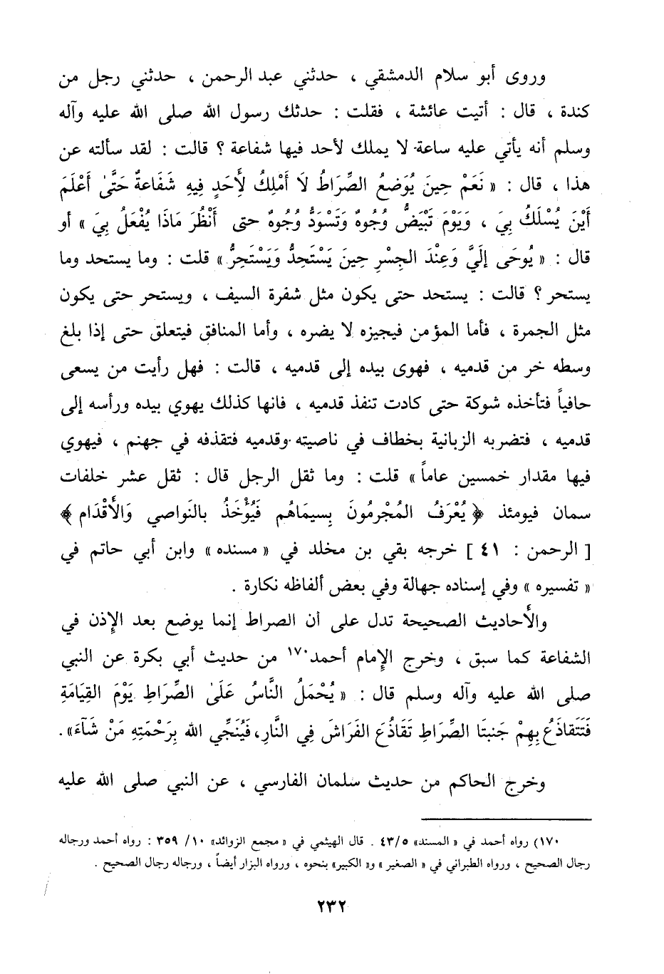 وروى أبو سلام الدمشقي: «حدثني عبد الرحمن، حدثني رجل من كندة، قال: أتيت عائشة، فقلت: حدثك رسول الله صَلَّى اللهُ عَلَيْهِ وَآلِهِ وَسَلَّمَ، أنه يأتي عليه ساعة لا يملك لأحد فيها شفاعة؟ قالت: لقد سألته عن هذا، قال: نعم، حين يوضع الصراط، لا أملك لأحد فيه شفاعة، حتى أعلم أين يسلك بي، ويوم تبيض وجوه وتسود وجوه، حتى أنظر ماذا يفعل بي أو قال: يوحى إلي، وعند الجسر، حين يستحد ويستحر قلت: وما يستحد وما يستحر؟ قالت: يستحد حتى يكون مثل شفرة السيف، ويستحر حتى يكون مثل الجمرة، فأما المؤمن، فيجيزه لا يضره، وأما المنافق، فيتعلق، حتى إذا بلغ وسطه، خر من قدميه، فهوى بيده إلى قدميه، قالت: فهل رأيت من يسعى حافياً، فتأخذه شوكة حتى كادت تنفذ قدميه؟ ! فإنها كذلك، يهوي بيده ورأسه إلى قدميه، فتضربه الزبانية بخطاب في ناصيته وقدميه، فتقذفه في جهنم، فيهوي فيها مقدار خمسين عاماً قلت: وما ثقل الرجل قال: ثقل عشر خلفات سمان فيومئذ: