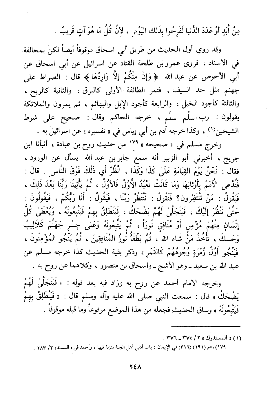 وقد روي أول الحديث من طريق أبي إسحاق مرقوفاً أيضاً بمخالفة في الإسناد، فروى عمرو بن طلحة القتاد عن إسرائيل، عن أبي إسحاق، عن أبي الأحوص، عن عبد الله {وإن منكم إلا واردها} قال الصراط على جهنم مثل حد السيف، فتمر الطائفة الأولى كالبرق، والثانية كالريح، والثالثة كأجود الخيل، والرابعة كأجود الإبل والبهائم، ثم يمرون والملائكة يقولون: رب سلم سلم.
