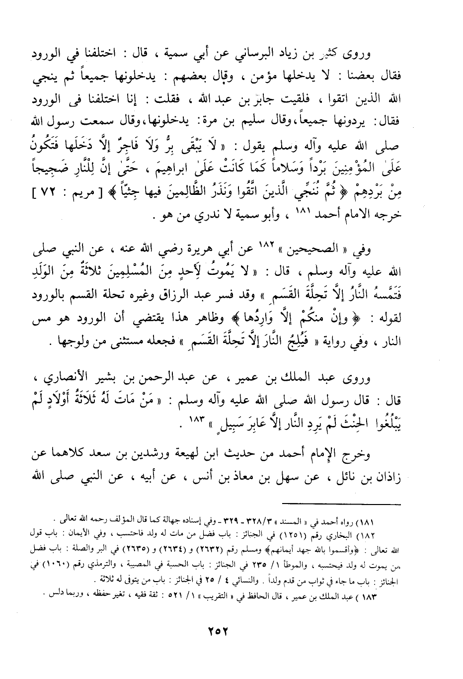 وفي الصحيحين، «عن أبي هريرة رضي الله عنه، عن النبي صَلَّى اللهُ عَلَيْهِ وَآلِهِ وَسَلَّمَ، قال: لا يموت لأحد من المسلمين ثلاثة من الولد، فتمسه النار، إلا تحلة القسم» .