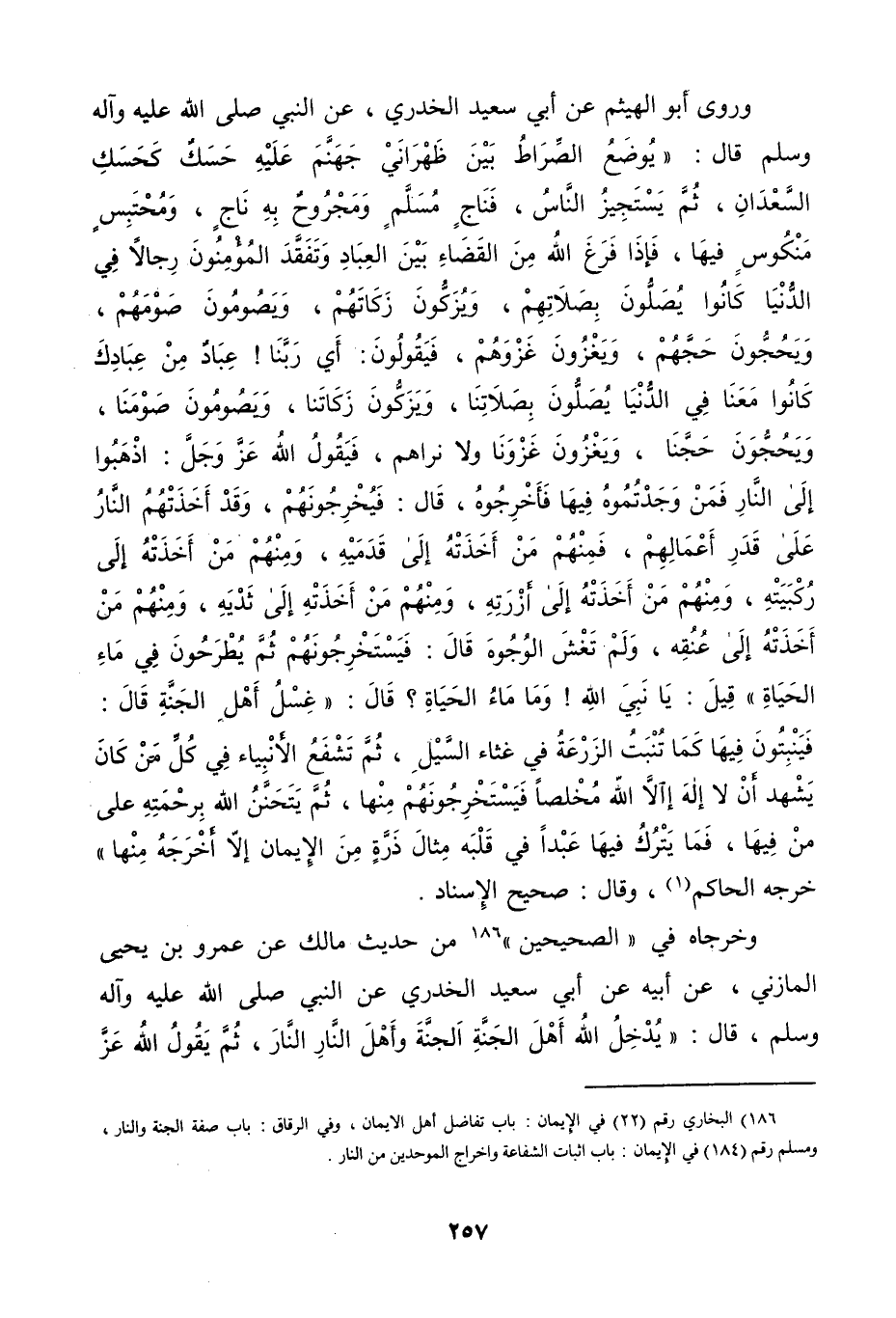 وخرجاه في الصحيحين، «من حديث مالك، عن عمرو بن يحيى المازني، عن أبيه، عن أبي سعيد الخدري، عن النبي صلى الله عليه وآله وسلم، قال: يدخل أهل الجنة الجنة، وأهل النار النار، ثم يقول الله عز